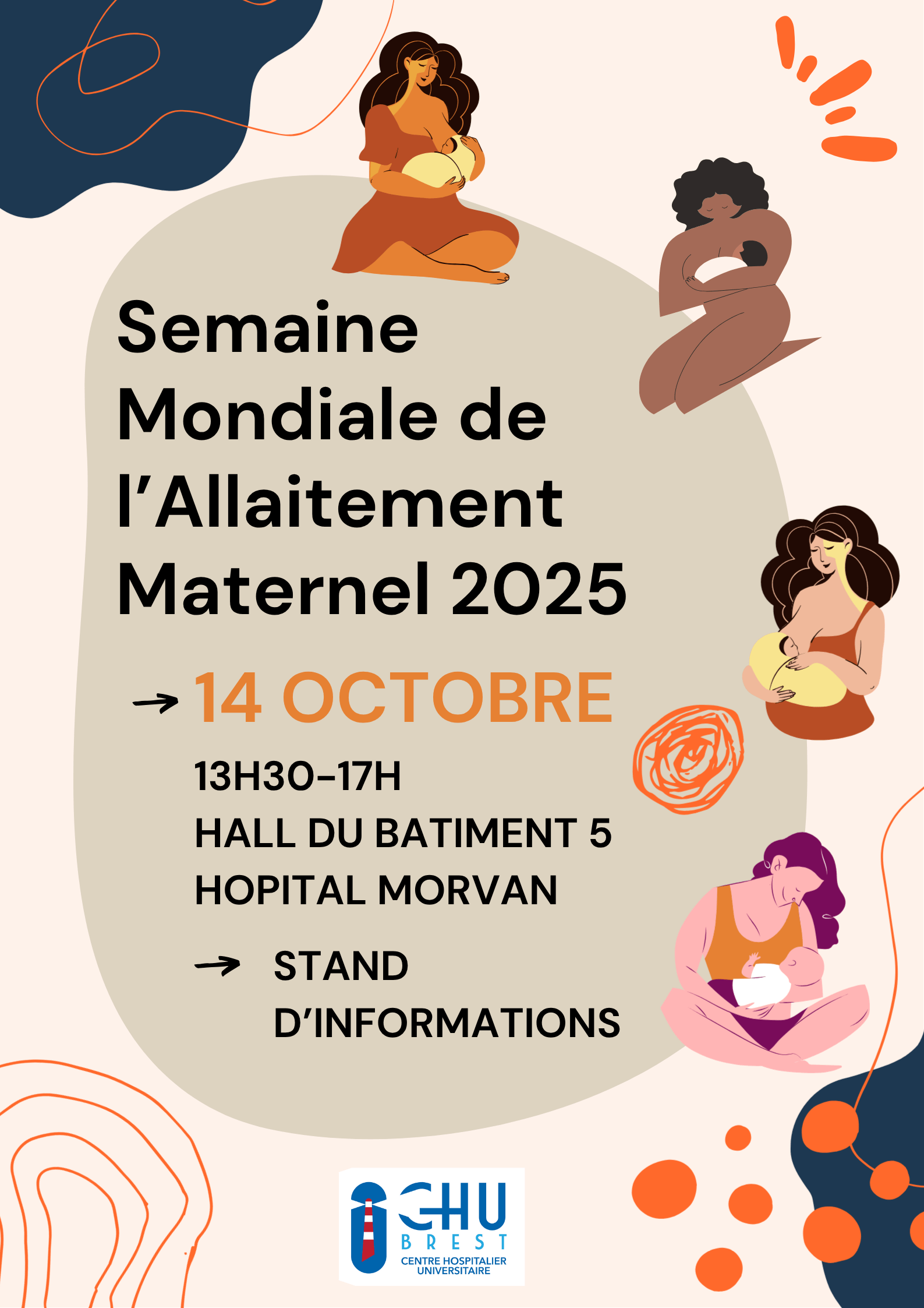 Le CHU de Brest vous propose un stand d’informations sur l’allaitement, le 14 octobre 2025 de 13h30 à 17h, dans le hall du bâtiment 5 de l’hôpital Morvan.