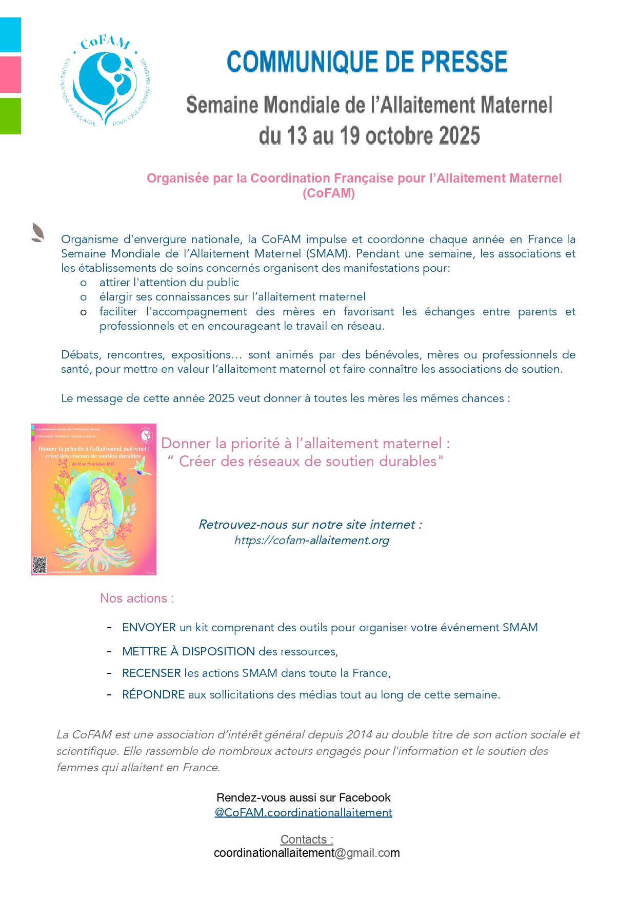 Organisme d’envergure nationale, la CoFAM impulse et coordonne chaque année en France la Semaine Mondiale de l’Allaitement Maternel (SMAM). Pendant une semaine, les associations et les établissements de soins concernés organisent des manifestations pour :