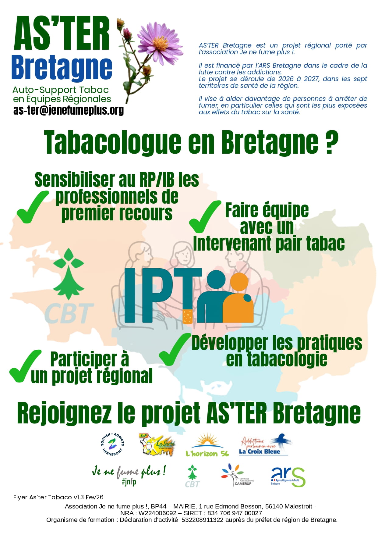 Le projet AS’TER est un dispositif régional d’accompagnement à l’arrêt du tabac destiné en priorité aux patient.es atteints de maladies respiratoires, de cancers, de maladies cardiovasculaires, aux femmes enceintes et aux personnes précaires résidant en Bretagne. Il est porté par l’association Je Ne Fume Plus, en partenariat avec l’ARS Bretagne et la Coordination Bretonne de Tabacologie.