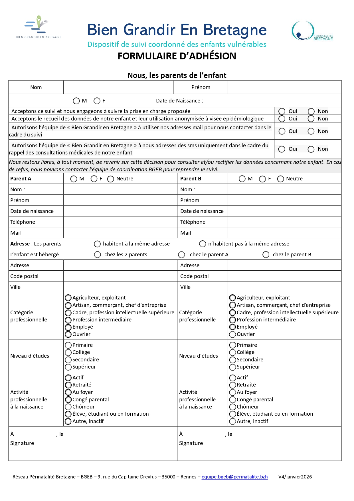 Seuls les professionnels qui le suivent et la coordination du réseau peuvent y avoir accès. À tout moment, vous pouvez, sur simple déclaration, revenir sur votre décision en contactant la cellule de coordination : equipe.bgeb@perinatalite.bzh.